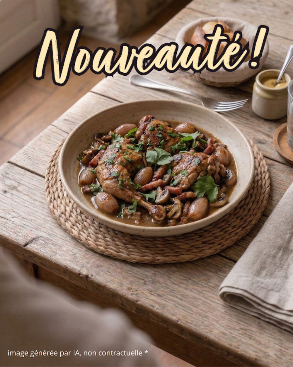 Lapin chasseur rissolé aux échalotes, lardons, champignons